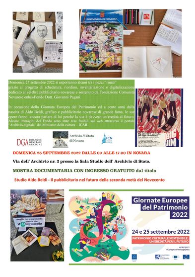 Dalle 9.00 alle 17.00 sarà visitabile, in modo gratuito, presso la Sala Studio dell’Archivio di Stato in Via dell’Archivio 2, la mostra documentaria intitolata “Studio Aldo Beldì - il pubblicitario nel futuro della seconda metà del Novecento”.